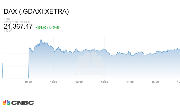 كما أغلق مؤشر DAX الألماني الجلسة على صعود 358.09 نقطة أو بنسبة 1.49% إلى مستوى 24367.47 نقطة.
