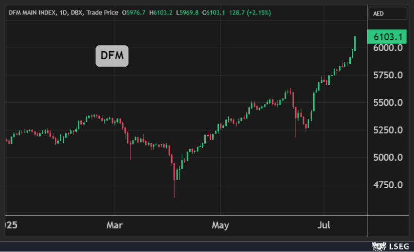 وفي سوق دبي، قفز المؤشر العام بأكثر من 2% ليغلق فوق مستويات 6100 نقطة لأول مرة في 17 عاماً بدعم من ارتفاع جميع القياديات.