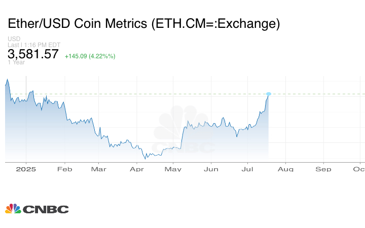 ووفقاً لشركة Coin Metrics، ارتفع سعر الإيثريوم بنسبة 3.6% ليصل إلى 3.558.68 دولاراً أميركياً، متداولًا عند أعلى مستوياته منذ يناير.