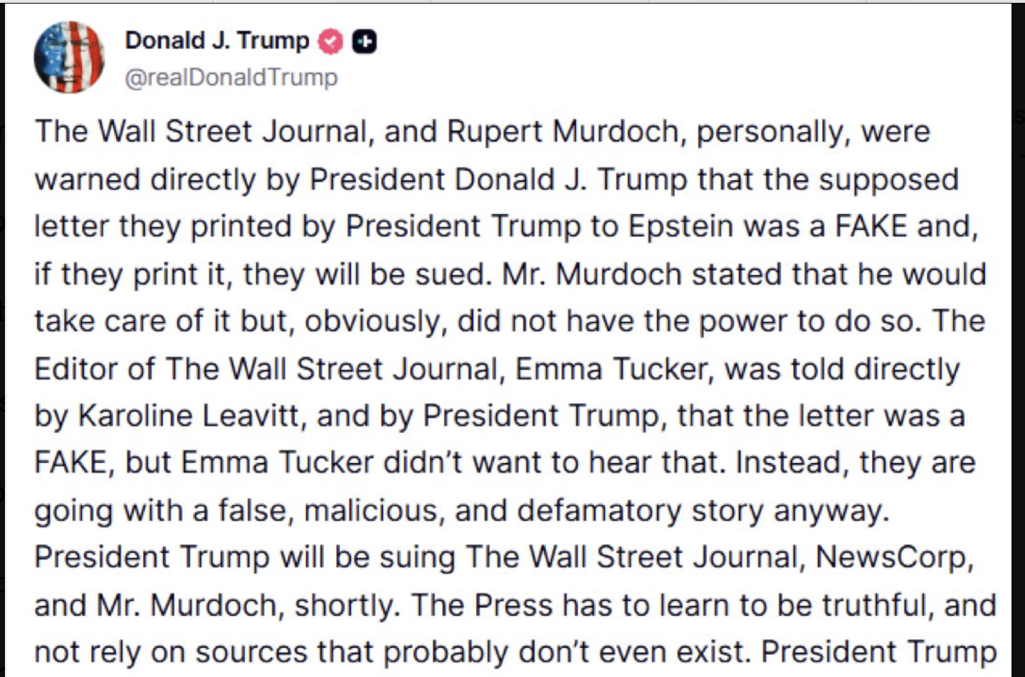 وفي منشور على منصته تروث سوشال للتواصل الاجتماعي قال الملياردير الجمهوري إن الرئيس ترامب سيقاضي قريباً صحيفة وول ستريت جورنال، ونيوزكورب، وروبرت مردوخ، مالك المجموعة الإعلامية، مؤكداً أنّه حذّرهم شخصياً قبل نشر المقال الخميس. ولم تنشر الصحيفة صورة عن الرسالة لكنّها أكّدت أنّها اطّلعت عليها، ووصفت مضمونها الإباحي.