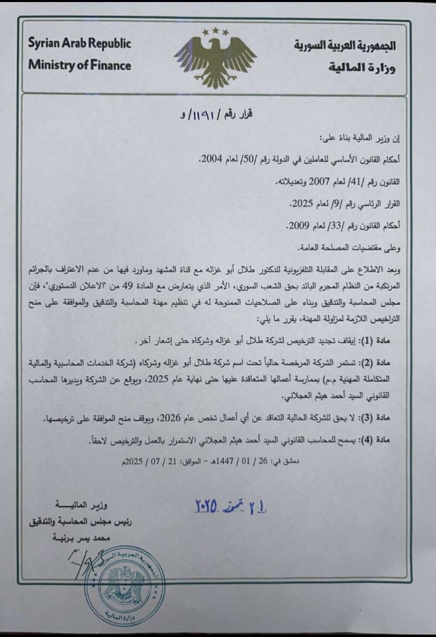 أعلن وزير المالية السوري محمد يسر برنية، يوم الاثنين 21 يوليو/ تموز، إلغاء ترخيص شركة "طلال أبوغزالة" في سوريا، والإلغاء جاء بسبب التصريحات التلفزيونية لطلال أبو غزالة صاحب المجموعة التي لم يعترف فيها بجرائم نظام بشار الأسد.