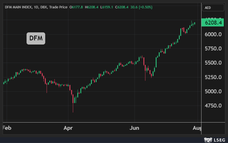 ووصلت مكاسب مؤشر سوق دبي إلى نحو 9% منذ بداية يوليو الحالي متجهاً لتسجيل رابع مكاسب شهرية على التوالي.