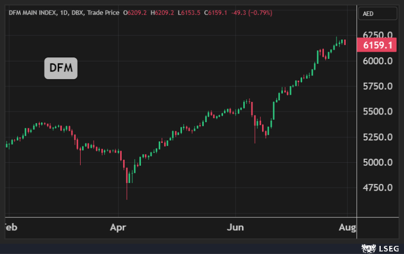 وعلى صعيد شهر يوليو، قفز مؤشر سوق دبي بنسبة 8% مسجلاً رابع مكاسب شهرية على التوالي، وأعلى مكاسب شهرية منذ نوفمبر 2020.