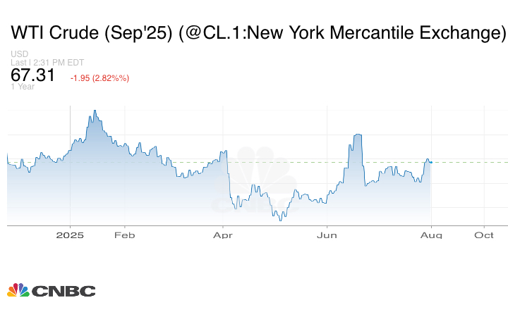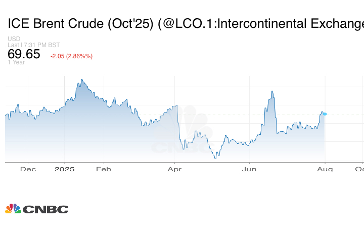 ويسجل خام برنت 4.9% هذا الأسبوع، فيما يتجه خام غرب تكساس الوسيط للصعود 6.4% بعد أن هدد الرئيس الأميركي دونالد ترامب في وقت سابق من هذا الأسبوع بفرض رسوم جمركية على مشتري الخام الروسي، وخاصة الصين والهند، للضغط على روسيا لوقف حربها ضد أوكرانيا.