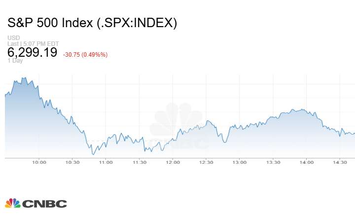 كما أغلق مؤشر S&P 500 التعاملات على هبوط 30.75 نقطة أو بنسبة 0.49% إلى 6299.19 نقطة.
