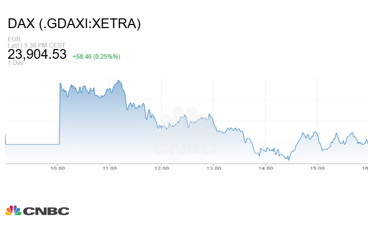 بينما أغلق مؤشر DAX الألماني الجلسة على صعود 58.46 نقطة أو بنسبة 0.25% إلى مستوى 23904.53 نقطة.