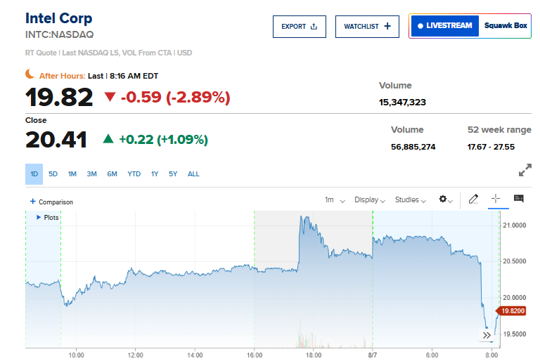 تعرّضت أسهم شركة «إنتل» لضغوط يوم الخميس بعدما دعا الرئيس دونالد ترامب إلى استقالة الرئيس التنفيذي للشركة بشكل فوري.