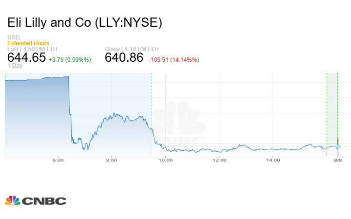 كان سهم Eli Lilly أيضاً من بين المتراجعين بشكل كبير خلال الجلسة، مع انخفاضه بنحو 14% بعد أن خيبت نتائج المرحلة الأخيرة من تجارب حبوبها لعلاج السمنة آمال المستثمرين. هذا على الرغم من إعلان الشركة نتائج أعمال للربع الثاني فاقت توقعات وول ستريت، ورفعت توقعاتها للعام بأكمله.