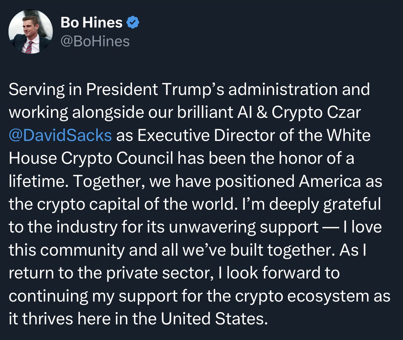 أعلن بو هاينز، الذي ترأس مجلس مستشاري الرئيس دونالد ترامب لشؤون الأصول الرقمية، أنه سيترك منصبه الحالي ويعود إلى القطاع الخاص.