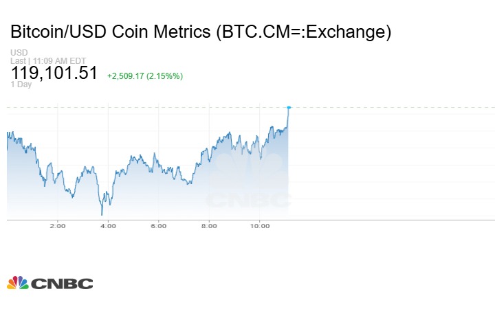 ارتفع سعر البتكوين بشكل مطرد، الأحد 10 أغسطس/ آب، مسجلاً ارتفاعاً جديداً حيث يقترب من 120 ألف دولار، وتجاوزت العملة المشفرة مبلغ 119 ألف دولار مرتفعة بأكثر من 2%.