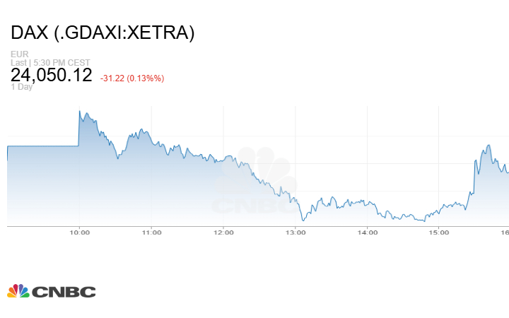 بينما أغلق مؤشر DAX الألماني الجلسة على هبوط 56.56 نقطة أو بنسبة 0.23% إلى مستوى 24024.78 نقطة.