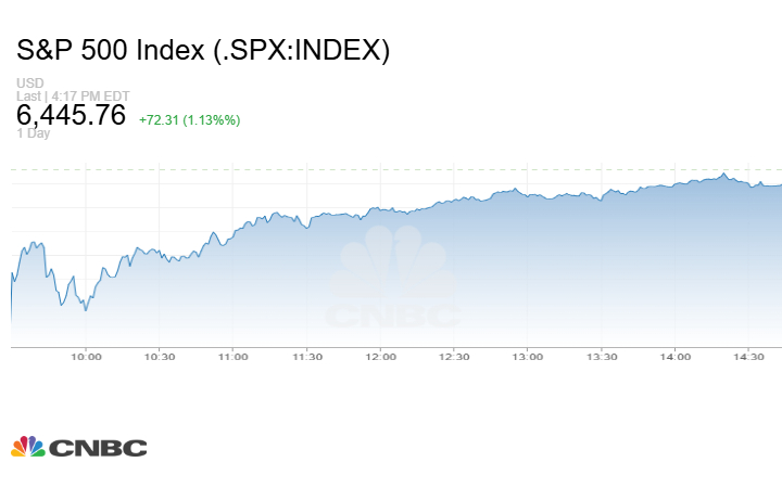 كما أغلق مؤشر S&P 500 التعاملات على صعود 72.31 نقطة أو بنسبة 1.13% إلى 6445.76 نقطة.
