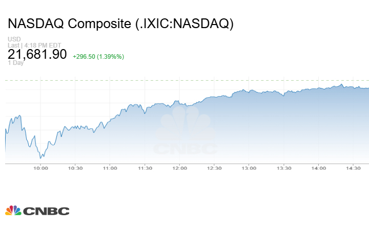 وزاد مؤشر Nasdaq المركب عند الإغلاق بنحو 296.50 نقطة أو بنسبة 1.39% إلى 21681.90 نقطة.