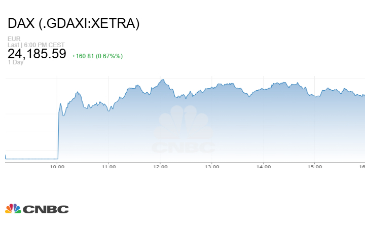 كما أغلق مؤشر DAX الألماني الجلسة على صعود 160.81 نقطة أو بنسبة 0.67% إلى مستوى 24185.59 نقطة.