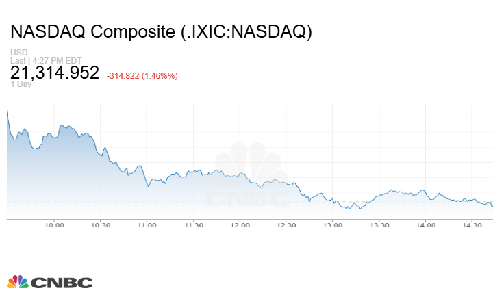 وهبط مؤشر Nasdaq المركب عند الإغلاق بنحو 314.82 نقطة أو بنسبة 1.46% إلى 21314.95 نقطة.
