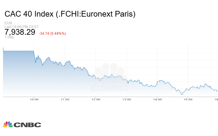 في حين هبط مؤشر CAC 40 الفرنسي بنحو 34.74 نقطة أو بنسبة 0.44% عند الإغلاق إلى مستوى 7938.29 نقطة.
