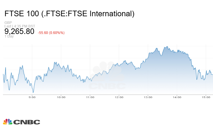 وتراجع مؤشر FTSE 100 البريطاني 55.60 نقطة أو بنسبة 0.60% عند الإغلاق إلى مستوى 9265.80 نقطة.