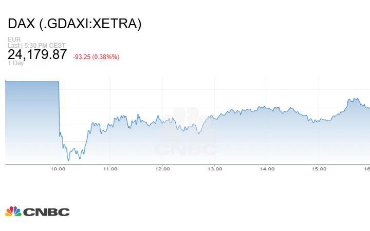 وأغلق مؤشر DAX الألماني الجلسة على هبوط 93.25 نقطة أو بنسبة 0.38% إلى مستوى 24179.87 نقطة.