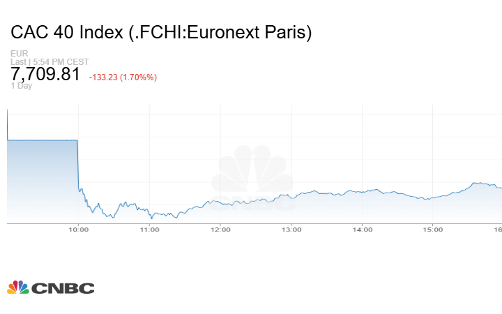 في حين هبط مؤشر CAC 40 الفرنسي بنحو 133.23 نقطة أو بنسبة 1.70% عند الإغلاق إلى مستوى 7709.81 نقطة.