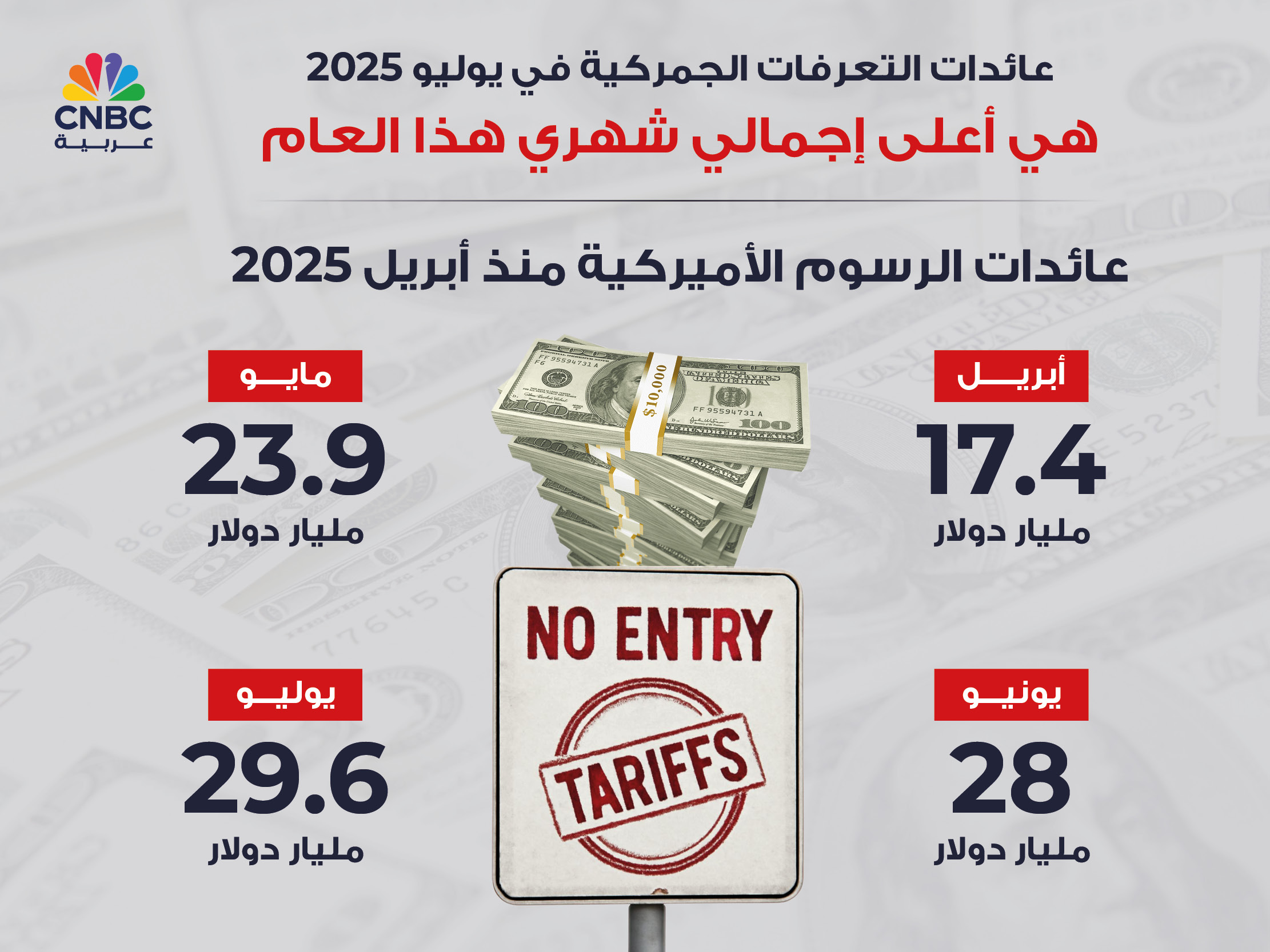 وتشكل عائدات التعرفات الجمركية في يوليو/ تموز 2025 أعلى إجمالي شهري هذا العام، بقيمة 29.6 مليار دولار، مقارنة مع 28 مليار دولار في يونيو/ حزيران، و23.9 مليار دولار في مايو/ آيار، و17.4 مليار دولار في أبريل/ نيسان.