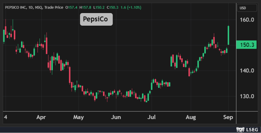 ارتفع سهم PepsiCo بنسبة 1.1% في جلسة الثلاثاء مسجلاً ثاني مكاسب يومية على التوالي، لتضيف الشركة 2.2 مليار دولار إلى قيمتها السوقية في يوم واحد.