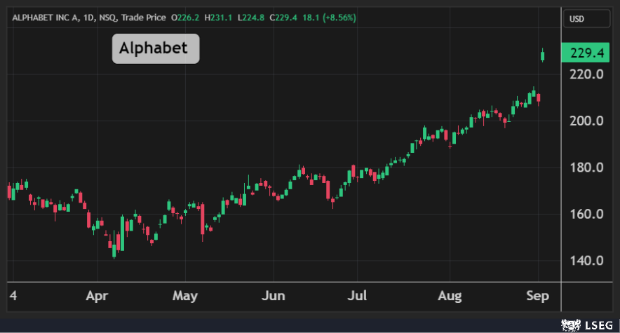 قفز سهم Alphabet بنسبة 9% في جلسة الأربعاء مسجلاً أعلى مكاسب يومية في 5 أشهر، لتضيف الشركة 232 مليار دولار إلى قيمتها السوقية في يوم واحد.