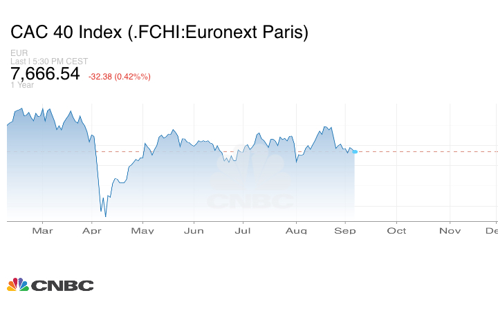 في حين أقفل مؤشر CAC 40 الفرنسي متراجعاً بنحو 0.42% إلى 7.666.54 نقطة عند الإغلاق.