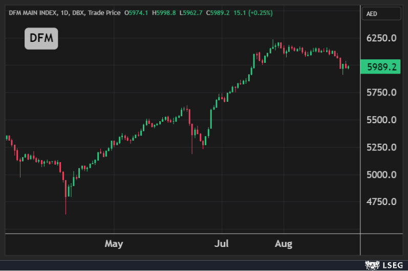 وفي سوق دبي، ارتفع المؤشر العام بنسبة 0.25% في جلسة الخميس، ولكنه ظل متراجعاً بنسبة 1.2% منذ بداية الأسبوع ليسجل رابع خسارة أسبوعية على التوالي وأكبر خسارة أسبوعية منذ منتصف يونيو الماضي.