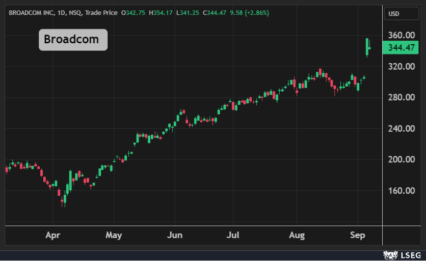 وزادت مكاسب السهم بعد أن صرّح الرئيس التنفيذي لشركة Broadcom، هوك تان، أن عميلاً رابعاً كبيراً قد قدّم طلبات بقيمة 10 مليارات دولار لرقائق الذكاء الاصطناعي المُخصصة، والتي تُطلق عليها الشركة اسم XPUs.