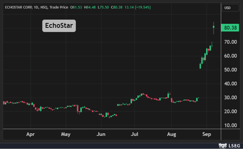 قفز سهم EchoStarبنسبة 20% في جلسة الإثنين إلى أعلى مستوياته على الإطلاق بعد أن وافقت شركة خدمات الاتصالات على بيع تراخيص الطيف اللاسلكي لشركة SpaceX لشبكة أقمارها الصناعية Starlink مقابل نحو 17 مليار دولار.