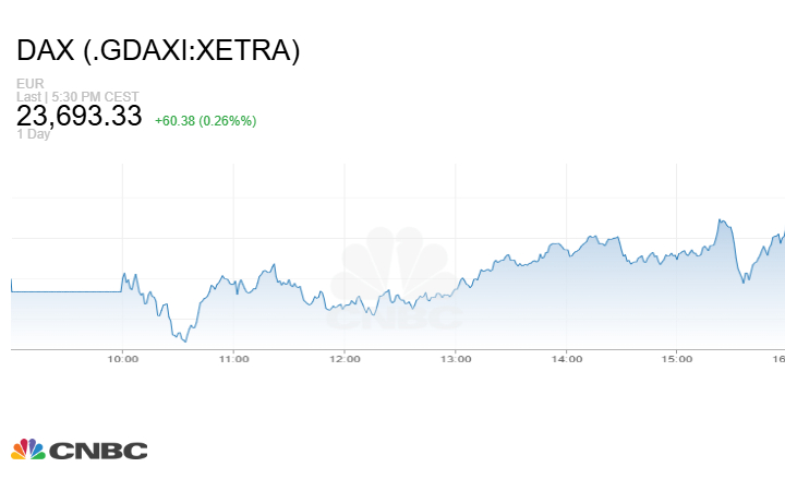 كما أغلق مؤشر DAX الألماني الجلسة على صعود 60.38 نقطة أو بنسبة 0.26% إلى مستوى 23693.33 نقطة.