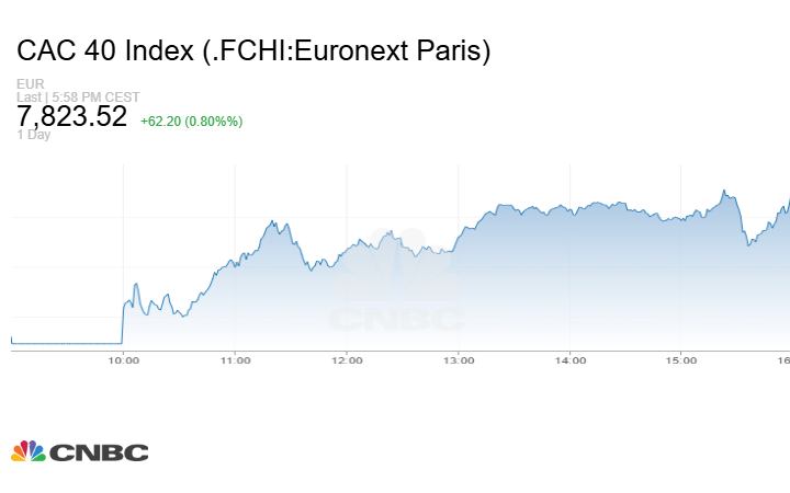 في حين صعد مؤشر CAC 40 الفرنسي بنحو 62.20 نقطة أو بنسبة 0.80% عند الإغلاق إلى مستوى 7823.52 نقطة.