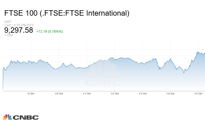 وزاد مؤشر FTSE 100 البريطاني 72.19 نقطة أو بنسبة 0.78% عند الإغلاق إلى مستوى 9297.58 نقطة.