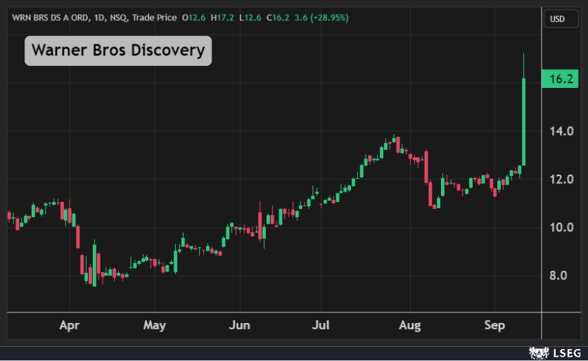 قفز سهم Warner Bros بنسبة 29% في جلسة الخميس محققاً أعلى مكاسب يومية في تاريخه.