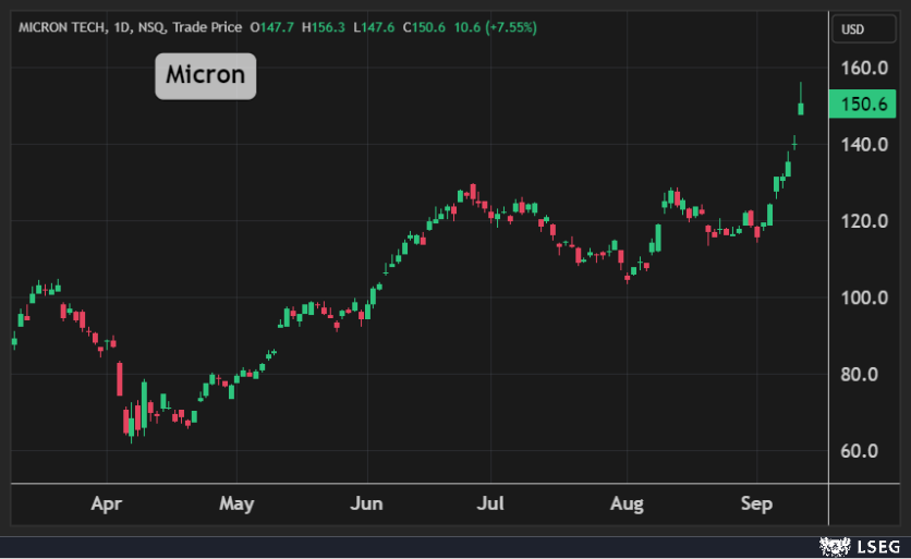 ارتفع سهم Micron بنسبة 7.5% في جلسة الخميس إلى أعلى مستوياته 15 شهراً، لتضيف الشركة 12 مليار دولار إلى قيمتها السوقية في يوم واحد.