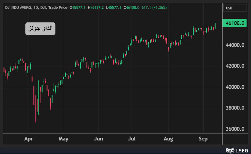 قفز مؤشر الداو جونز بنسبة 1.4% أي ما يعادل 617 نقطة في جلسة الخميس ليغلق فوق مستويات 46000 نقطة لأول مرة في تاريخه.