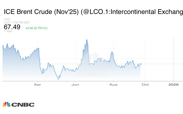 ارتفعت العقود الآجلة لخام برنت 45 سنتاً أو 0.67% إلى 67.44 دولار للبرميل عند التسوية.