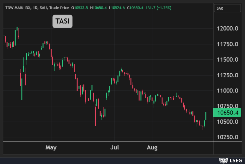 ارتفع مؤشر تاسي بنسبة 1.25% في جلسة الأربعاء مسجلاً أعلى مكاسب يومية في نحو شهرين بدعم من الارتفاع القوي لسهم أرامكو.