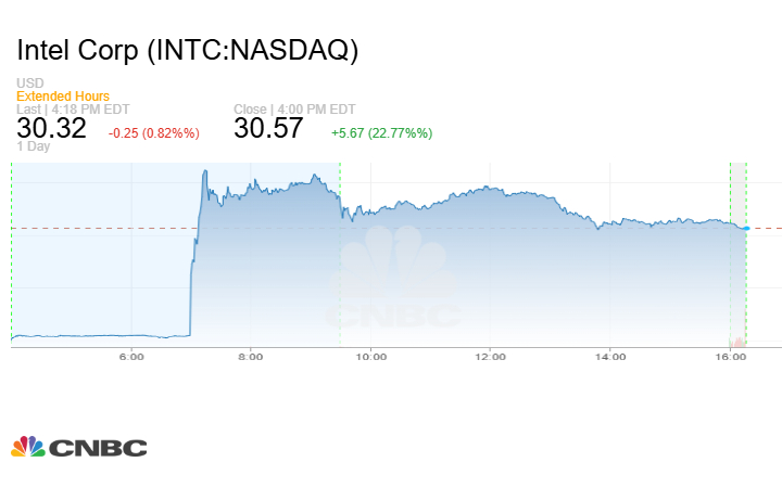 أغلقت أسهم شركة إنتل تعاملات جلسة يوم الخميس 18 سبتمبر/ أيلول على ارتفاع 22.8% محققة أفضل أداء يومي لها منذ أكتوبر/ تشرين الأول 1987، وذلك بعد إعلان شركة إنفيديا في وقت سابق من اليوم أنها ستستثمر خمسة مليارات دولار في إنتل.