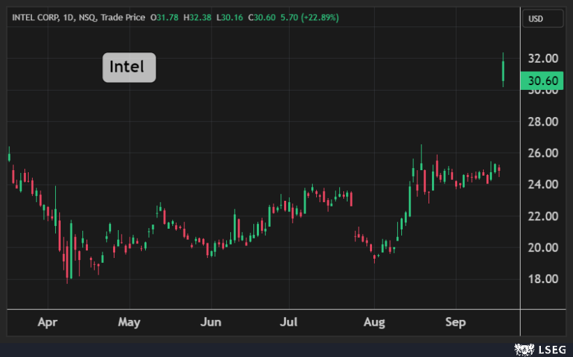 قفز سهم Intelبنسبة 23% في جلسة الخميس مسجلاً أعلى مكاسب يومية منذ عام 1987 أي منذ 38 عاماً ، لتضيف الشركة 26 مليار دولار إلى قيمتها السوقية في يوم واحد.