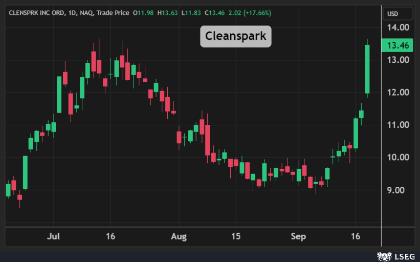 كما قفز سهم Cleanspark بنسبة 18% محققاً أعلى إغلاق يومي منذ بداية العام الحالي.
