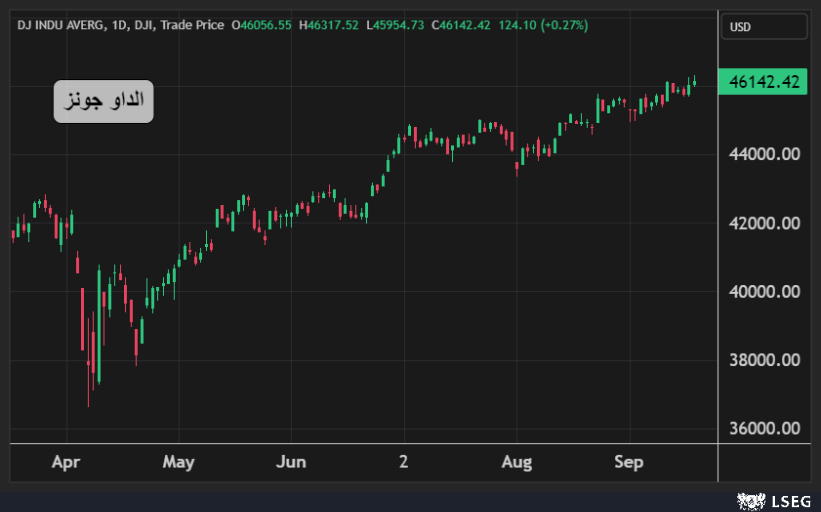 ارتفع مؤشر الداو جونز بنسبة 0.3% أي ما يعادل 124 نقطة في جلسة الخميس ليسجل إغلاقاً قياسياً جديداً عند مستويات 46142 نقطة.