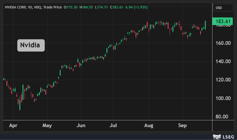 قفز سهم Nvidia بنسبة 3.9% في جلسة الإثنين مسجلاً إغلاقاً قياسياً جديداً بعد إعلانها عن استثمار 100 مليار دولار في OpenAI.