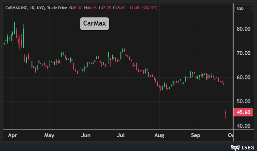 هبط سهم شركة CarMax بنسبة 20% في جلسة الخميس إلى أدنى مستوياته في أكثر من 5 سنوات بعد أن أعلنت شركة بيع السيارات المستعملة عن انخفاض أرباحها في الربع الثاني.