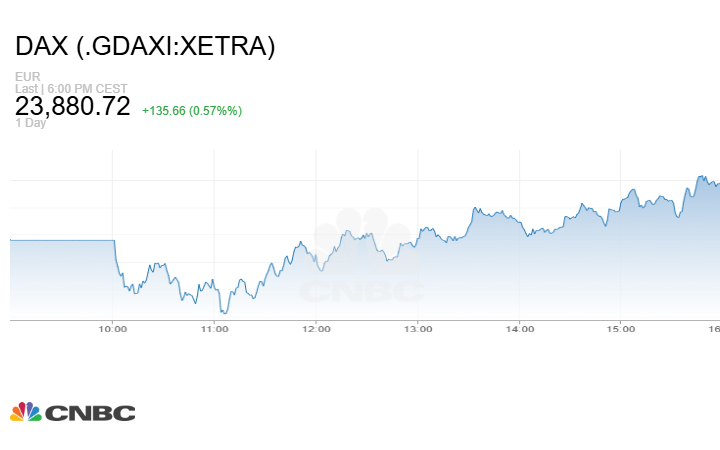 كما أغلق مؤشر DAX الألماني الجلسة على صعود 135.66 نقطة أو بنسبة 0.57% إلى مستوى 23880.72 نقطة. وعلى المستوى الشهري سجل المؤشر انخفاضاً بنسبة 0.09%، وعلى مستوى الربع الثالث سجل المؤشر تراجعاً بنسبة 0.12%.