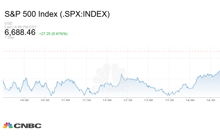 كما أغلق مؤشر S&P 500 التعاملات على صعود 27.25 نقطة أو بنسبة 0.41% إلى 6688.46 نقطة.