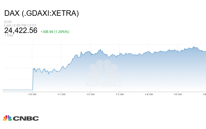 كما أغلق مؤشر DAX الألماني الجلسة على صعود 308.94 نقطة أو بنسبة 1.28% إلى مستوى 24422.56 نقطة، مُتصدراً مكاسب البورصات الإقليمية الرئيسية.