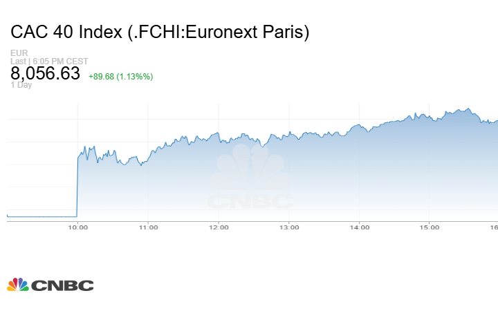 في حين صعد مؤشر CAC 40 الفرنسي بنحو 89.68 نقطة أو بنسبة 1.13% عند الإغلاق إلى مستوى 8056.63 نقطة.