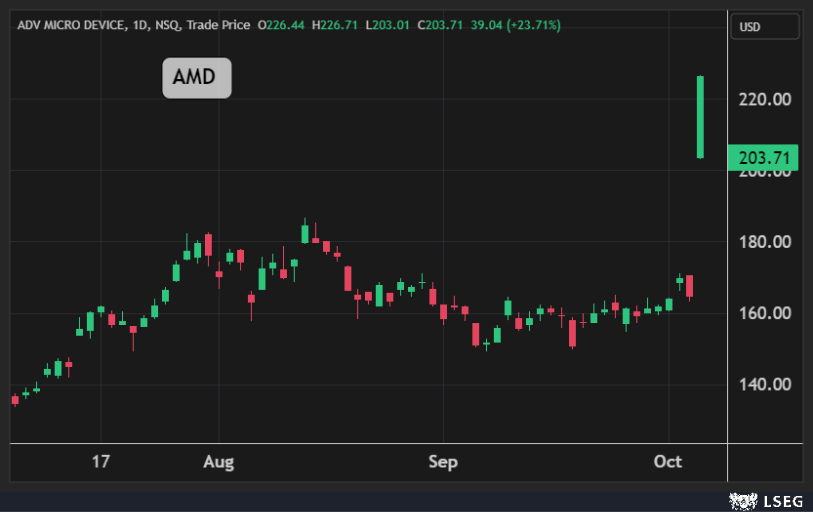 قفز سهم AMD بنسبة 24% في جلسة الإثنين إلى أعلى مستوياته في عام ونصف، لتضيف الشركة 63 مليار دولار إلى قيمتها السوقية في يوم واحد.
