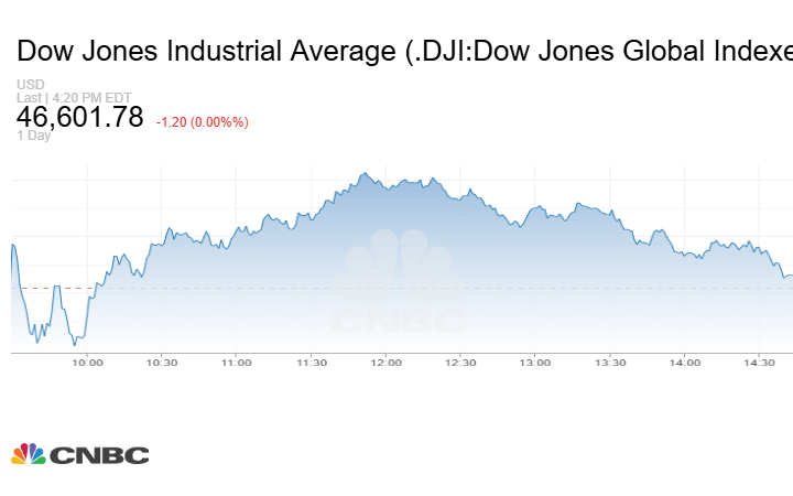 استقر مؤشر Dow Jones الصناعي تقريباً مع انخفاض طفيف جداً بنحو 1.20 نقطة عند إغلاق تعاملات الأربعاء إلى 46601.78 نقطة.